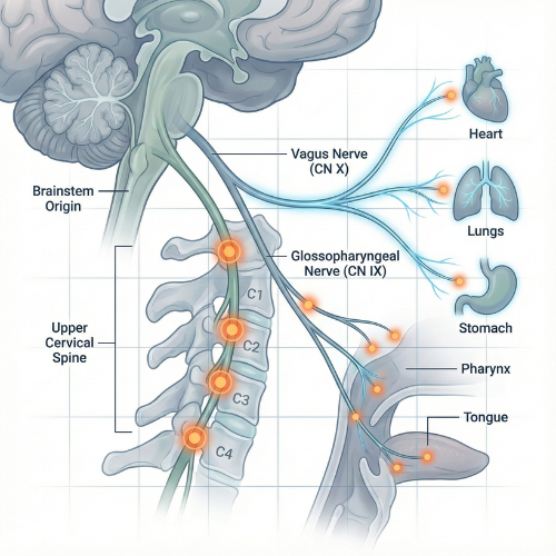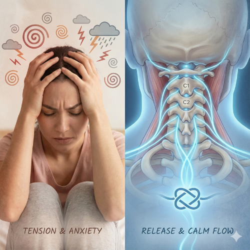 The vagus and glossopharyngeal nerves regulate heart rhythm, digestion, balance, and calm. When compressed near the C1–C2 region, they lose efficiency. Blood flow drops. Signals misfire. The body enters a constant state of internal confusion. This is why people feel “off” without clear test results — the issue is functional, not imaginary.