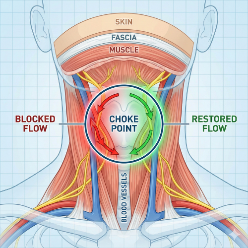 Pills change chemistry. Chiropractors focus on alignment. Stretching targets surface muscles. But none address the neurovascular choke point at the base of the skull where muscle, fascia, blood flow, and nerve conduction intersect. Without releasing and retraining this area, compression returns — and so do the symptoms.
