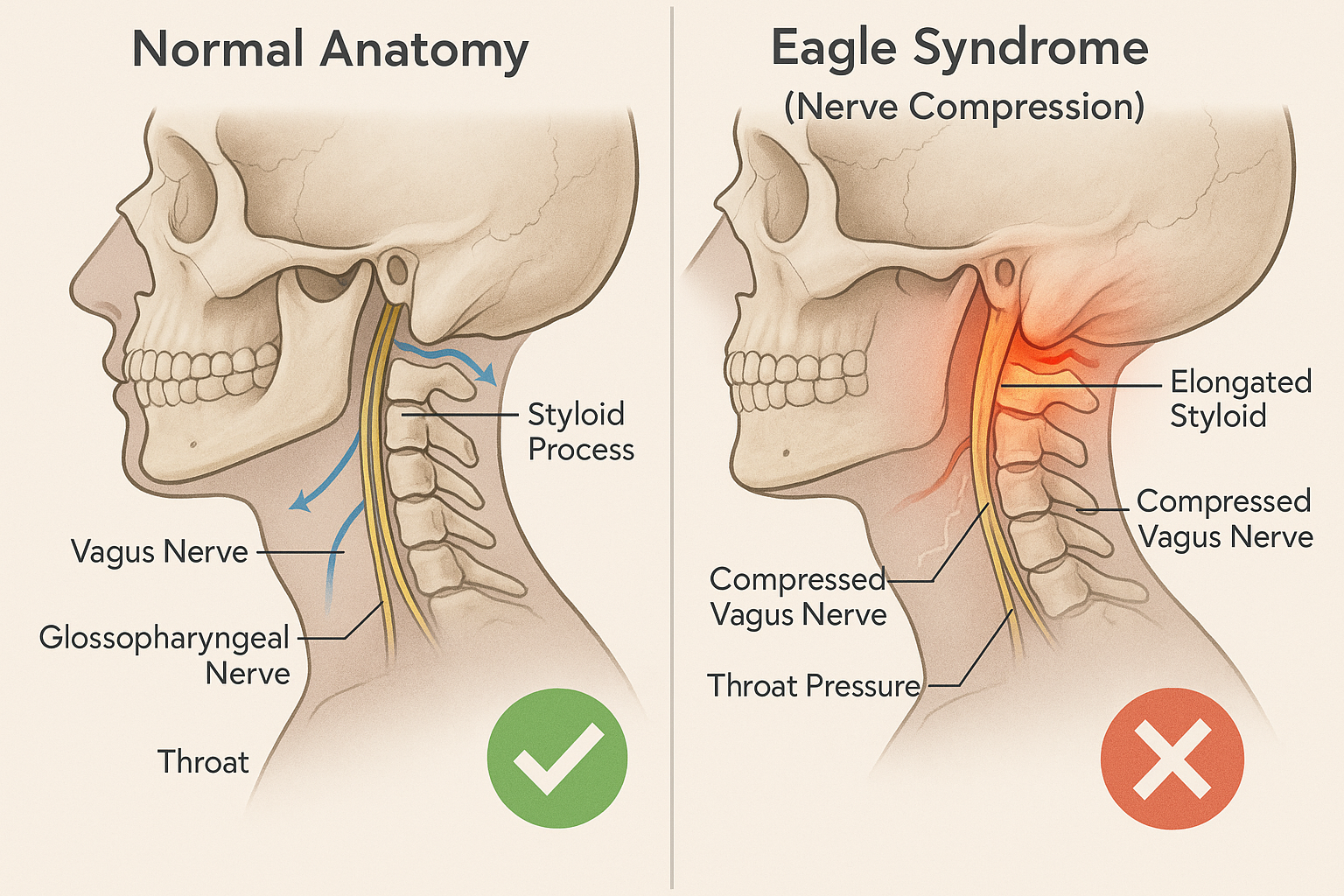 But for many patients with Eagle Syndrome, the root cause is structural: an elongated or misshaped styloid process pressing into the vagus and glossopharyngeal nerves.