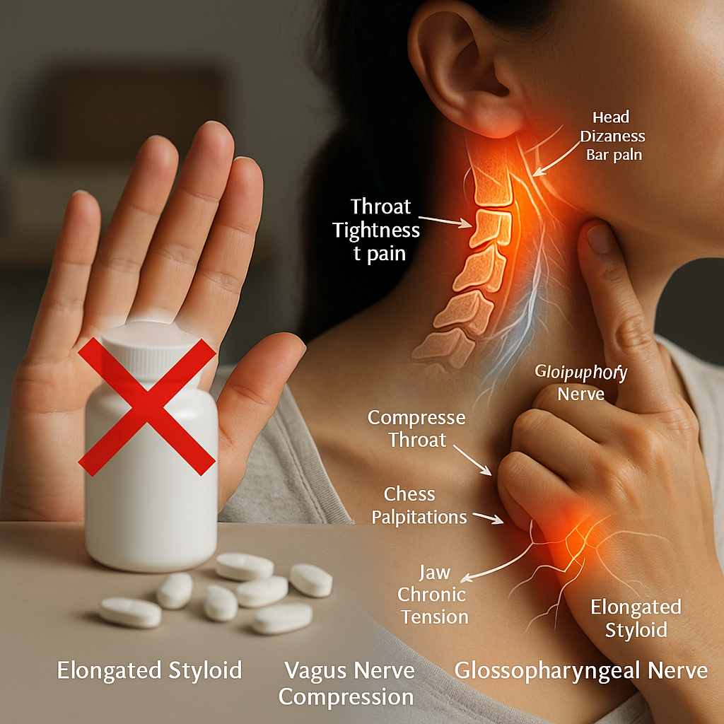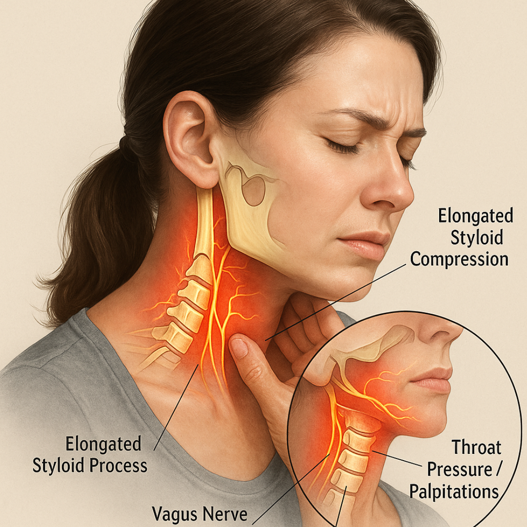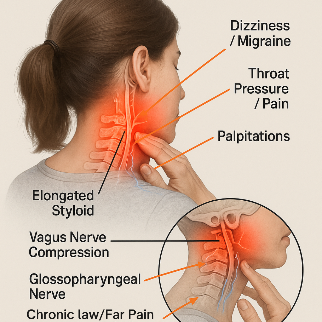 An elongated styloid process can press into the vagus and glossopharyngeal nerves, but the symptoms appear far away, as dizziness, throat tightness, palpitations, jaw or ear pain, and even digestive issues.